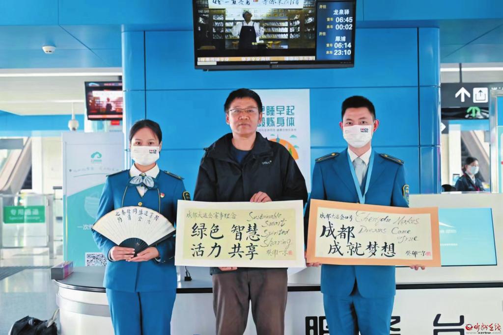 成都大運會期間一爾(中)的書法作品被地鐵志愿者服務(wù)站收藏