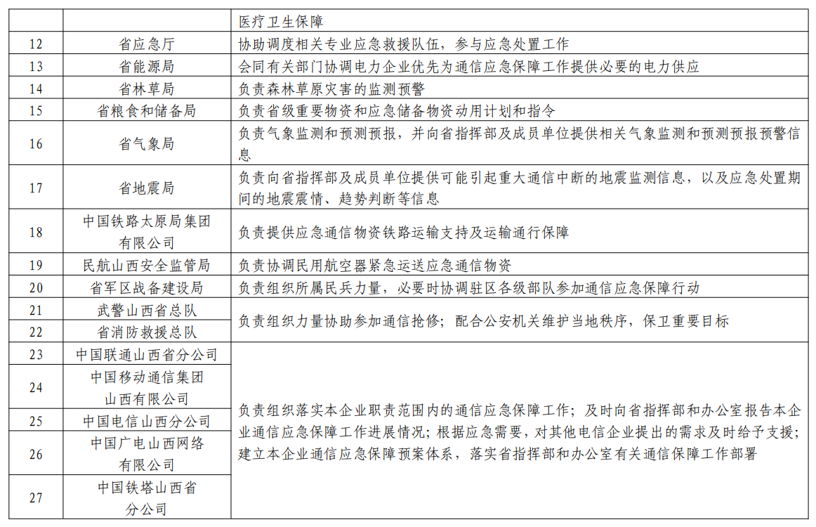 成員:省通信管理局、省委宣傳部、省委網(wǎng)信辦、省發(fā)展改革委、省公安廳、省財政廳、省自然資源廳、省交通廳、省水利廳、省衛(wèi)健委、省應(yīng)急廳、省能源局、省林草局、省糧食和儲備局、省氣象局、省地震局、中國鐵路太原局集團(tuán)有限公司、民航山西安全監(jiān)管局、省軍區(qū)戰(zhàn)備建設(shè)局、武警山西省總隊、省消防救援總隊以及省基礎(chǔ)電信企業(yè)等部門單位相關(guān)負(fù)責(zé)人。