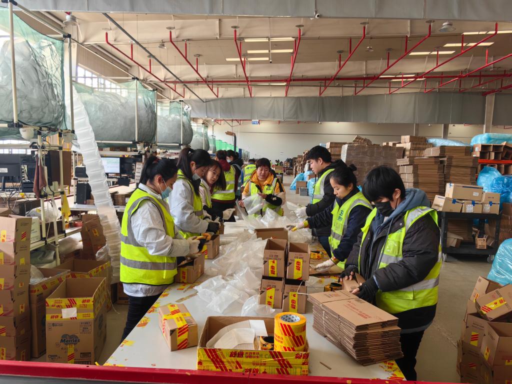 1月22日,在位于山東煙臺的日韓消費品跨境電商中心京東綜合倉內,工作人員將貨物分揀、打包。新華社記者 邵琨 攝