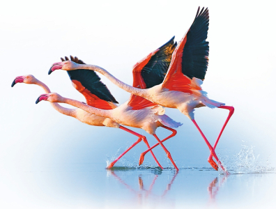 11月23日,初冬的運(yùn)城濕地省級(jí)自然保護(hù)區(qū)(鹽湖段)水面澄澈,灘涂鋪展,火烈鳥亭亭玉立,時(shí)而低頭啄食,時(shí)而曲頸戲水,時(shí)而平展振翅。