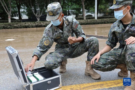 8月6日,武警河北總隊機動支隊官兵在河北涿州高新區(qū)騰飛大街勘測檢查氣體環(huán)境。新華社發(fā)(趙佳亮 攝)