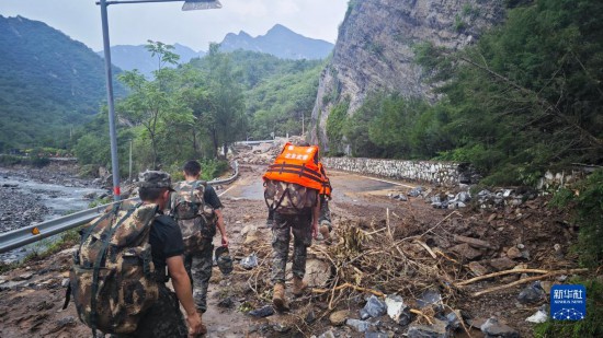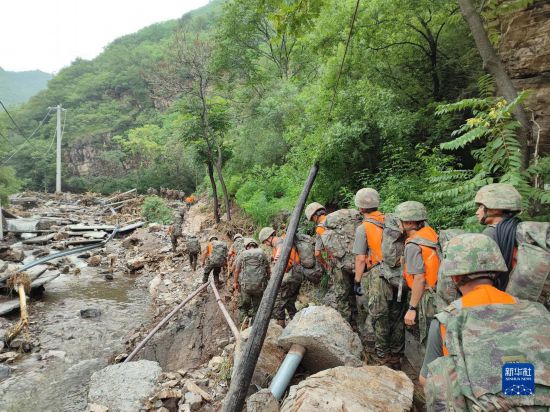 因山洪暴發(fā),北京市門頭溝區(qū)齋堂鎮(zhèn)交通中斷。武警北京總隊機動第一支隊應急救援隊徒步15公里山路,人均負重25公斤,為12個村運送食品、醫(yī)藥、防疫、照明等基礎物資,保障村民基本生活。