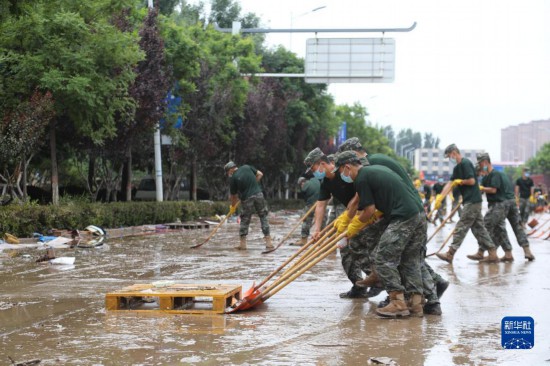 8月6日,武警河北總隊機動支隊官兵在河北涿州騰飛大街范陽路至朝陽路段清淤清障。新華社發(fā)(趙佳亮 攝)