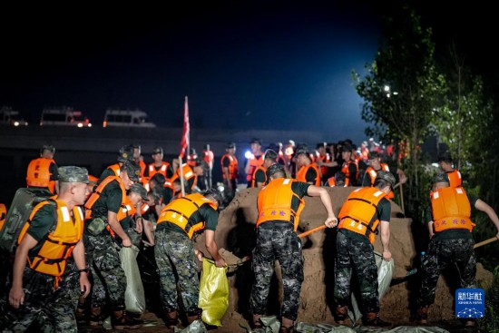 武警河北總隊邢臺支隊官兵在河北邢臺南澧河李召橋左岸大堤加固堤壩(7月31日攝)。新華社發(fā)(張羽 攝)