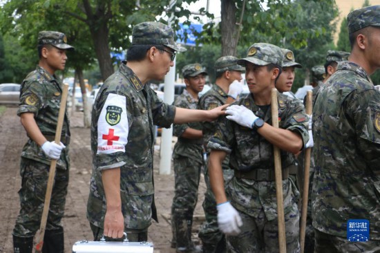 8月6日,武警河北總隊醫(yī)院巡診組在河北涿州陽光大街清理淤泥點位詢問戰(zhàn)士傷情。新華社發(fā)(楊雪乾 攝)