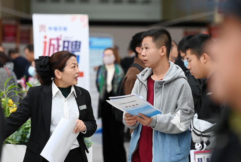2023年11月10日,天津,求職者在招聘會(huì)現(xiàn)場(chǎng)與用人單位交流。新華社記者 趙子碩 攝