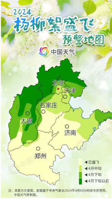 以華北地區(qū)最早開始飄絮的白毛楊為例,當(dāng)日平均氣溫大于0℃時(shí),白毛楊才能正常生長發(fā)育,將這些超過0℃的數(shù)值累加起來,當(dāng)總和達(dá)到480℃,且日平均氣溫達(dá)到14℃,楊絮就開始飄飛。華北一帶,往往4月上旬前后達(dá)到這一標(biāo)準(zhǔn)。楊絮飄飛10余天后,柳絮也會(huì)進(jìn)入飄飛期。