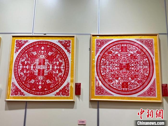 現(xiàn)場(chǎng)展出的盤(pán)合作品和《婚俗服飾》系列剪紙作品。楊靜攝
