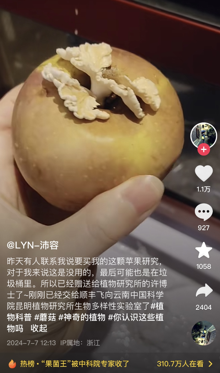一顆“長菌蘋果”的奇幻漂流,引發(fā)了媒體聚焦。據(jù)潮新聞報道,上個月末,浙江梅雨不斷。浙江德清的鄧小姐發(fā)現(xiàn),家里放了一個多月的蘋果上,竟長出了白色的蘑菇。她在抖音上曬出圖片,登上抖音熱榜,那顆“長菌蘋果”被網(wǎng)友戲稱為“果菌王”。