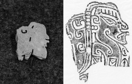 其中一件玉石上陽(yáng)刻的側(cè)身人像,頭戴冠帽、橄欖形眼、高鼻梁、大嘴巴,生動(dòng)的形象和精美的工藝與長(zhǎng)江中游后石家河文化中的玉人(神)像如出一轍。
