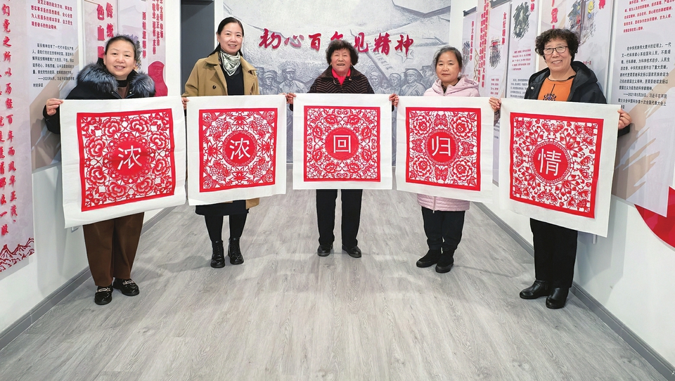 12月17日,陽泉市城區(qū)下站街道,陽泉市級非遺傳承人董淑芳(左二)與剪紙愛好者展示主題剪紙作品。當(dāng)日,下站街道舉辦“濃濃回歸情”主題剪紙活動,慶祝澳門回歸祖國25周年。所展示的剪紙作品圖案有的是澳門特別行政區(qū)區(qū)花蓮花,有的是象征團結(jié)繁榮的牡丹花,還有象征福氣與好運的福蝶和象征吉祥富貴的金魚。一幅幅精美的剪紙作品,表達(dá)了大家濃濃的愛國之情。