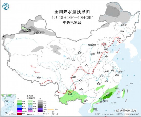 全國降水量預報圖(12月18日08時-19日08時)