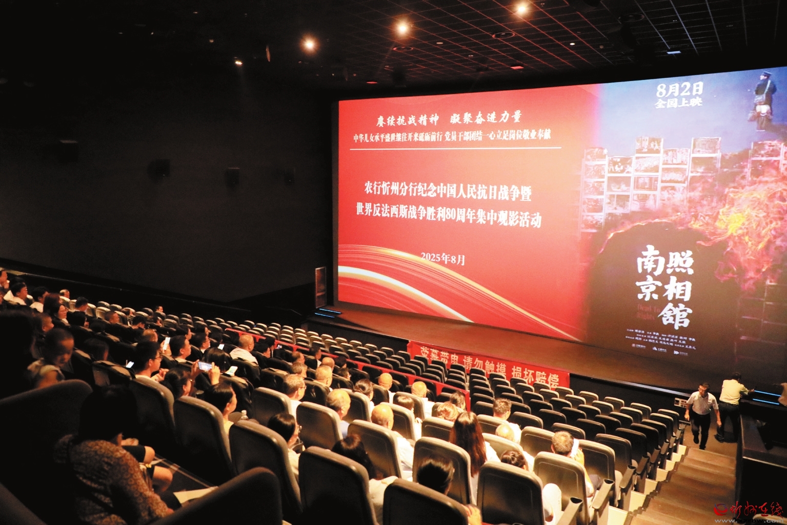 為紀(jì)念中國人民抗日戰(zhàn)爭暨世界反法西斯戰(zhàn)爭勝利80周年,8月22日,農(nóng)行忻州分行組織市分行機(jī)關(guān)及城區(qū)支行的黨員干部聯(lián)合開展了以“賡續(xù)抗戰(zhàn)精神,凝聚奮進(jìn)力量”為主題的黨日活動(dòng),并集體觀看了電影《南京照相館》。(殷俊攝)