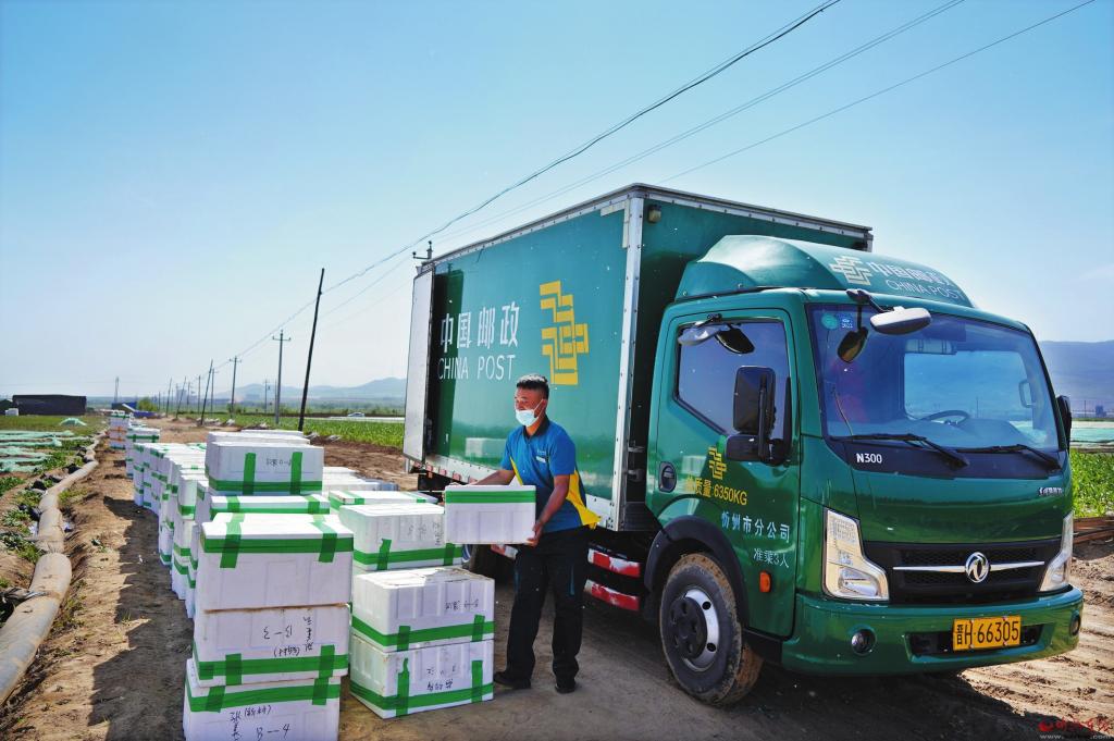 6月18日,天貓網(wǎng)購節(jié),五寨縣郵政公司將郵政運(yùn)輸車輛直接開到該縣蔬菜生產(chǎn)基地,將新鮮的蔬菜及時發(fā)往全國各地。 張向榮攝