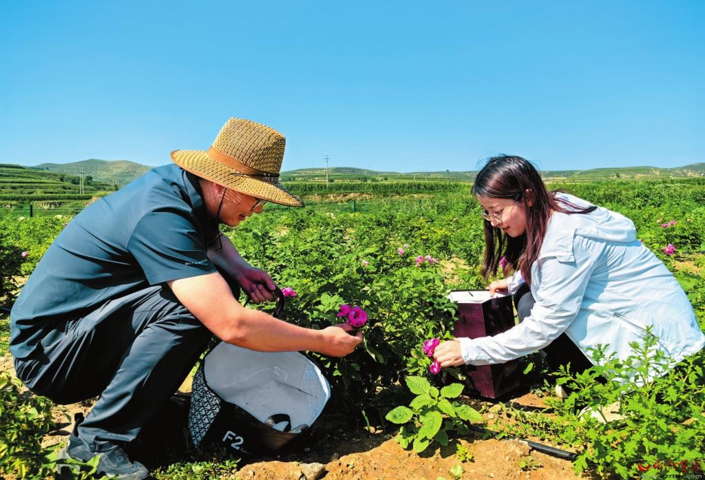 在食用玫瑰花收獲的季節(jié),神池縣八角鎮(zhèn)八角村的到村工作大學生幫助農(nóng)戶進行采摘。 吳 杰攝