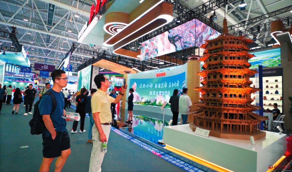山西晟龍木雕模型藝術(shù)有限公司制作的應(yīng)縣木塔模型一亮相,便吸引了眾多觀展游客的目光。精美絕倫的造型引得人們嘖嘖稱奇,紛紛拿出手機拍照記錄分享。該模型高約3米,最大直徑1.9米,通過20∶1的比例微縮打造,復(fù)刻了應(yīng)縣木塔的榫卯結(jié)構(gòu),其內(nèi)部樓梯扶手清晰可見,門窗都能打開?!拔覀兊倪@件展品,是由二十多個師傅經(jīng)過半年多的時間完成的。這次為了來深圳參展,我們專門把它從定襄裝運發(fā)車,用了整整兩天半的時間才送到,跨越了將近兩千公里。”該公司總經(jīng)理張艷峰告訴記者。
