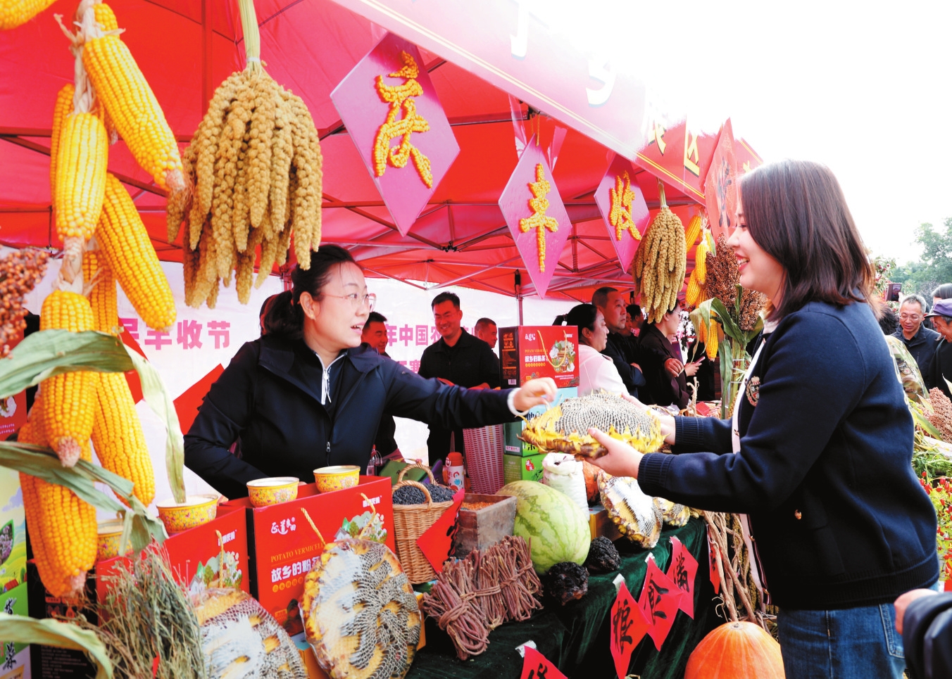 圖為農(nóng)貿(mào)展區(qū)工作人員正在向群眾介紹新培育的大葵花。范琛攝