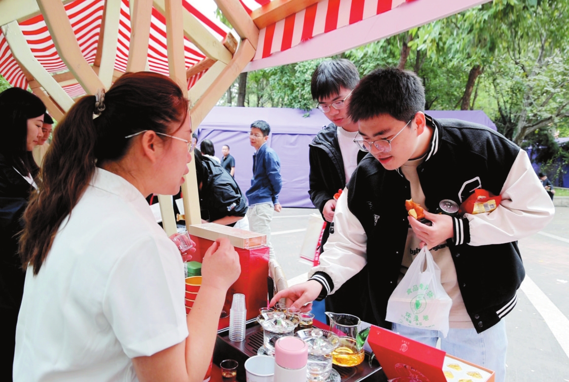 我市在清華大學(xué)國防教育林舉辦秋季學(xué)期學(xué)生地域文化節(jié)暨“人到山西好風(fēng)光”忻州專場活動。圖為清華大學(xué)學(xué)生品嘗毛建茶。本報記者范琛攝