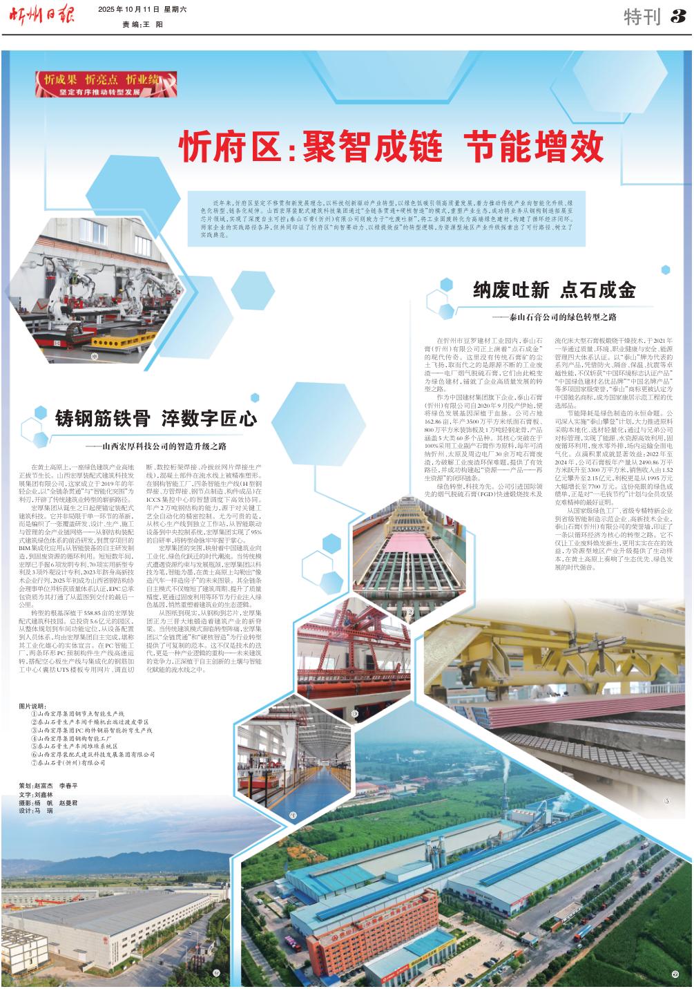 近年來,忻府區(qū)堅定不移貫徹新發(fā)展理念,以科技創(chuàng)新驅(qū)動產(chǎn)業(yè)轉(zhuǎn)型,以綠色低碳引領(lǐng)高質(zhì)量發(fā)展,著力推動傳統(tǒng)產(chǎn)業(yè)向智能化升級、綠色化轉(zhuǎn)型、鏈條化延伸。山西宏厚裝配式建筑科技集團通過“全鏈條貫通+硬核智造”的模式,重塑產(chǎn)業(yè)生態(tài),成功將業(yè)務(wù)從鋼構(gòu)制造拓展至芯片領(lǐng)域,實現(xiàn)了深度自主可控;泰山石膏(忻州)有限公司則致力于“吃廢吐新”,將工業(yè)固廢轉(zhuǎn)化為高端綠色建材,構(gòu)建了循環(huán)經(jīng)濟閉環(huán)。兩家企業(yè)的實踐路徑各異,但共同印證了忻府區(qū)“向智要動力、以綠提效益”的轉(zhuǎn)型邏輯,為資源型地區(qū)產(chǎn)業(yè)升級探索出了可行路徑、樹立了實踐典范。