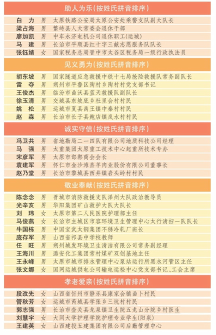 本次活動評選出山西助人為樂好人、山西見義勇為好人、山西誠實守信好人、山西敬業(yè)奉獻好人、山西孝老愛親好人共31人。