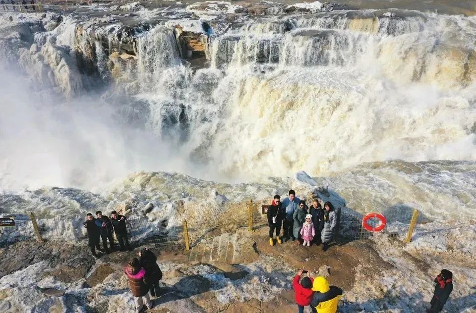 ▲2月9日,游客在吉縣黃河壺口瀑布游覽觀瀑?!傲⒋骸焙螅軞鉁鼗嘏绊?,吉縣黃河壺口瀑布冰消河開,再現(xiàn)奔騰咆哮的壯美景觀。呂桂明攝