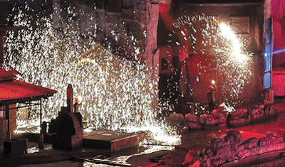 大年初七,晚上7點(diǎn),山西省晉城市司徒小鎮(zhèn)的山水實(shí)景劇《千年鐵魂》準(zhǔn)時(shí)開演。當(dāng)臺(tái)上的幾位工匠將金黃色的鐵水一齊拋灑向天空,絢爛的鐵花在空中綻放,氣勢(shì)磅礴。觀眾的情緒也在此刻到達(dá)頂峰。