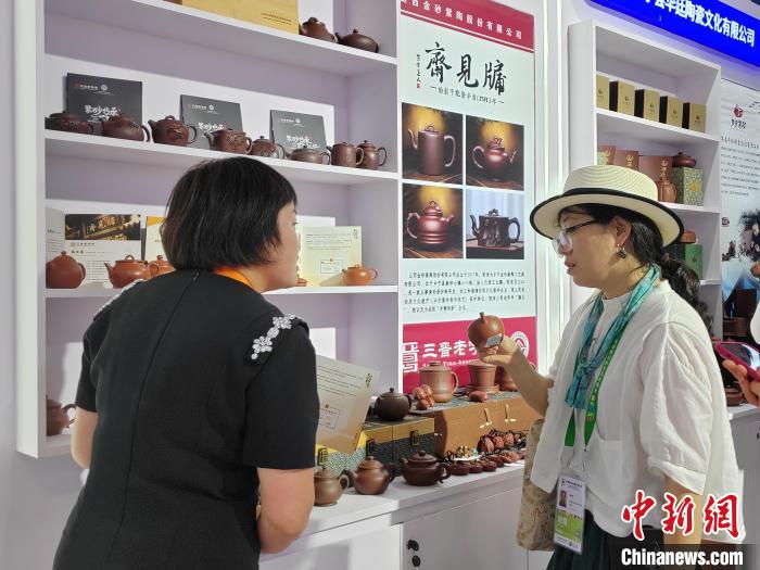 現(xiàn)場(chǎng)工作人員向觀眾介紹山西鄉(xiāng)寧紫砂陶器。高雨晴 攝