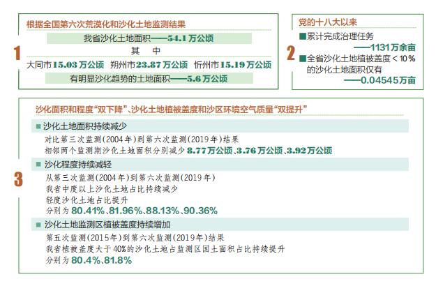 荒漠化是影響人類生存和發(fā)展的全球性重大生態(tài)問題。我省晉西北和晉北地區(qū)是全國荒漠化監(jiān)測與防治的重點(diǎn)地區(qū)之一。經(jīng)過長期積極探索,不斷創(chuàng)新機(jī)制和科學(xué)防沙治沙,我省實(shí)現(xiàn)了沙化面積和程度“雙下降”、沙化土地植被蓋度和沙區(qū)環(huán)境空氣質(zhì)量“雙提升”的實(shí)際成效。