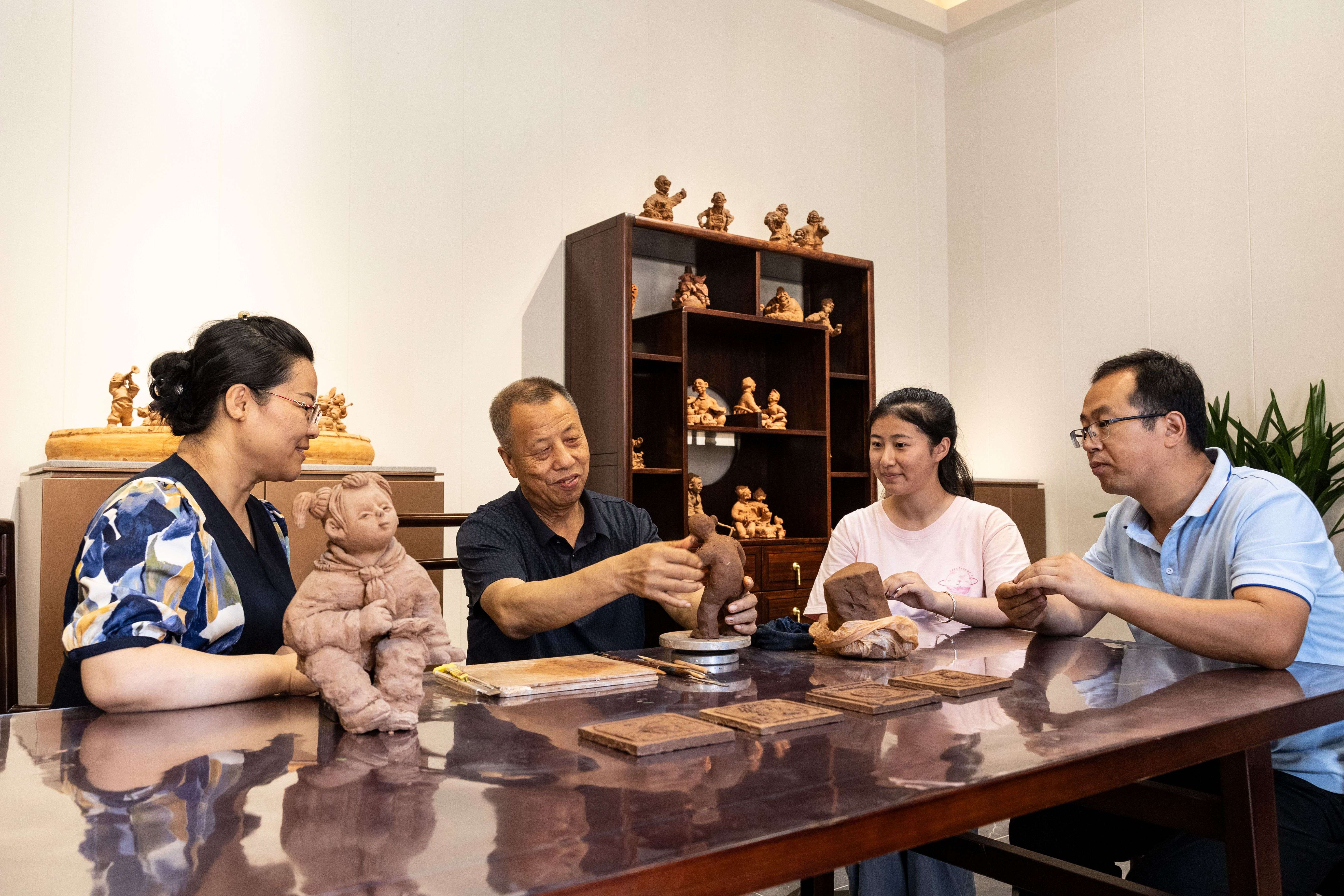 走進釜山村的棋盤六院里,高大兩層古建質(zhì)樸自然,門楣上的木雕繁復(fù)美觀。院子里一間泥塑工坊內(nèi),非遺傳承人史月明正在創(chuàng)作。