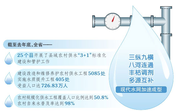 截至去年底,全省25個(gè)縣開(kāi)展了縣域農(nóng)村供水“3+1”標(biāo)準(zhǔn)化建設(shè)和管護(hù)工作;建設(shè)改造和維修養(yǎng)護(hù)農(nóng)村供水工程5085處,實(shí)施水質(zhì)提升工程405處,受益人口達(dá)726.83萬(wàn)人;農(nóng)村規(guī)?;┧こ谈采w人口比例達(dá)到50.8%,農(nóng)村自來(lái)水普及率達(dá)到98%。