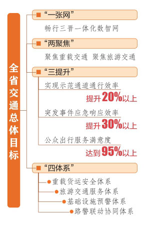 其中,“一張網(wǎng)”指搭建一張暢行三晉一體化數(shù)智網(wǎng)?!皟删劢埂笔侵攸c(diǎn)聚焦重載交通、旅游交通。“三提升”是實(shí)現(xiàn)示范通道通行效率提升20%以上,突發(fā)事件應(yīng)急響應(yīng)效率提升30%以上,公眾出行服務(wù)滿意度達(dá)到95%以上。“四體系”則是形成重載貨運(yùn)安全體系、旅游交通服務(wù)體系、基礎(chǔ)設(shè)施預(yù)警體系和路警聯(lián)動(dòng)協(xié)同體系。