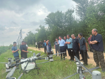 8月18日下午,在朔城區(qū)高升農(nóng)機(jī)專業(yè)合作社的試驗田里,一場別開生面的“病蟲害綠色防控田間課堂”正在進(jìn)行——沒有黑板粉筆,取而代之的是嗡嗡作響的無人機(jī)、閃著藍(lán)光的太陽能殺蟲燈,還有掛在玉米稈上不起眼的小卡片……來自全區(qū)各鄉(xiāng)鎮(zhèn)的種糧大戶代表、農(nóng)機(jī)合作社負(fù)責(zé)人、農(nóng)技人員共計50余人一起觀摩學(xué)習(xí)。