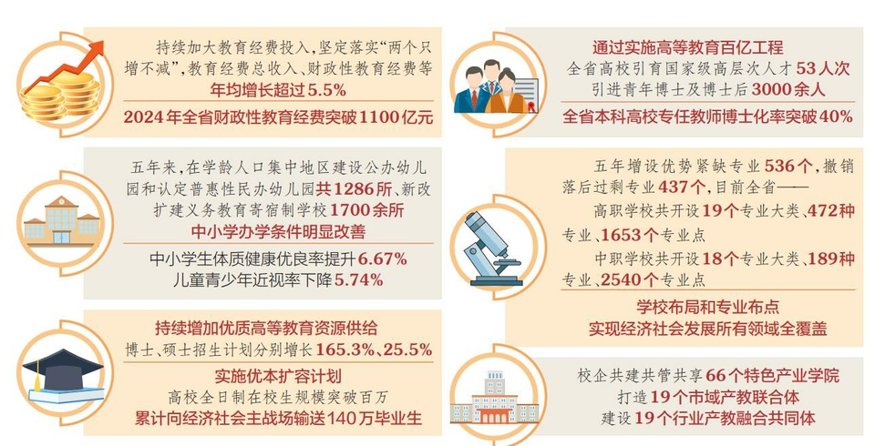 省委教育工委書記,省教育廳黨組書記、廳長馬駿介紹,“十四五”期間,我省持續(xù)加大教育經(jīng)費投入,堅定落實“兩個只增不減”,教育經(jīng)費總收入、財政性教育經(jīng)費等年均增長超過5.5%,2024年全省財政性教育經(jīng)費突破1100億元。推進基礎(chǔ)教育擴優(yōu)提質(zhì),組建600個城鄉(xiāng)教育共同體,有序增加高中學(xué)位供給,20萬人口以上的縣實現(xiàn)特殊教育學(xué)校全覆蓋,隨遷子女、殘疾兒童平等接受教育得到充分保障。學(xué)生資助體系實現(xiàn)學(xué)段、學(xué)校、學(xué)生全覆蓋,累計惠及1373萬人次。今年起免除公辦幼兒園學(xué)前一年保教費,群眾的教育獲得感、幸福感持續(xù)提升。