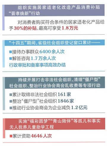 “十四五”期間,我省堅(jiān)持“規(guī)范與發(fā)展并重、監(jiān)管與服務(wù)并舉”,持續(xù)深化改革,健全體制機(jī)制,完善政策措施,推動(dòng)社會(huì)組織高質(zhì)量發(fā)展取得新成效。推行“零見面審批、最多跑一次”和線上年報(bào)“零跑動(dòng)”,省、市、縣三級(jí)社會(huì)組織登記實(shí)現(xiàn)“一網(wǎng)通辦”。統(tǒng)一規(guī)范申請(qǐng)材料、表格表單、辦事流程、章程文本等,政務(wù)服務(wù)標(biāo)準(zhǔn)化、規(guī)范化水平持續(xù)提升。推進(jìn)社會(huì)組織規(guī)范化建設(shè),健全綜合監(jiān)管、聯(lián)合執(zhí)法、資金管理等制度機(jī)制,加強(qiáng)對(duì)社會(huì)組織名稱、宗旨、業(yè)務(wù)范圍、發(fā)起人和擬任負(fù)責(zé)人的審核把關(guān),強(qiáng)化對(duì)社會(huì)組織內(nèi)部治理、人員、資金、活動(dòng)等日常監(jiān)管。持續(xù)開展打擊非法社會(huì)組織、清理“僵尸型”社會(huì)組織、整治行業(yè)協(xié)會(huì)商會(huì)亂收費(fèi)等專項(xiàng)行動(dòng),推動(dòng)行業(yè)協(xié)會(huì)商會(huì)為企業(yè)減負(fù)1.2億元。