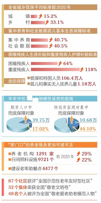 “目前,全省城鄉(xiāng)低保平均標(biāo)準(zhǔn)分別達(dá)到每人每月669元、555元,已有11個(gè)縣(市、區(qū))實(shí)現(xiàn)城鄉(xiāng)低保標(biāo)準(zhǔn)相統(tǒng)一。”省民政廳黨組書記、廳長李建紅介紹,我省建立最低生活保障標(biāo)準(zhǔn)與人均消費(fèi)支出掛鉤的動(dòng)態(tài)調(diào)整機(jī)制,從2022年起,各縣(市、區(qū))城鄉(xiāng)低保標(biāo)準(zhǔn)分別按當(dāng)?shù)厣夏甓瘸青l(xiāng)居民人均消費(fèi)支出的30%—40%和45%—55%確定。