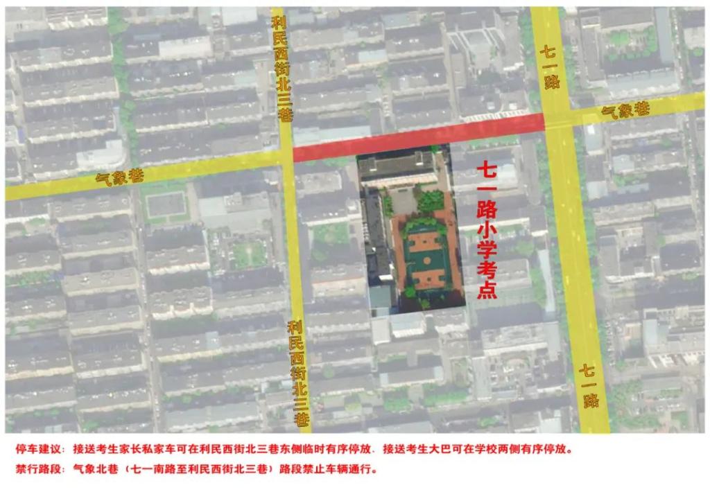 停車建議:接送考生家長私家車可在利民西街北三巷東側(cè)臨時有序停放,接送考生大巴可在學(xué)校兩側(cè)有序停放。