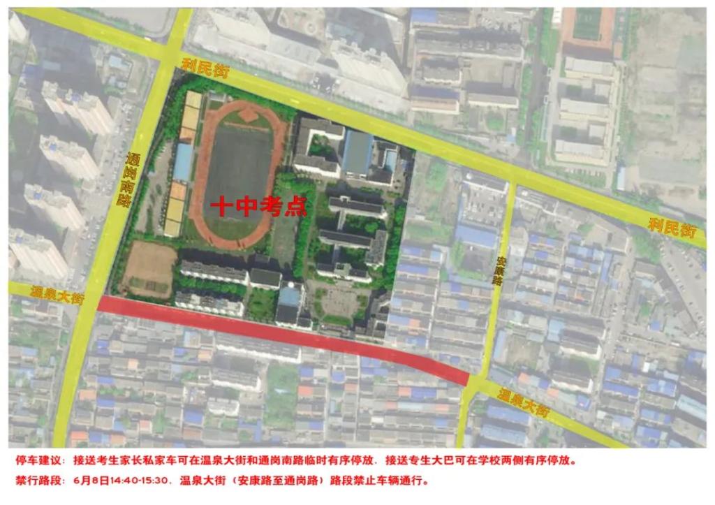停車建議:接送考生家長私家車可在溫泉大街和通崗南路臨時有序停放,接送考生大巴可在學(xué)校兩側(cè)有序停放。