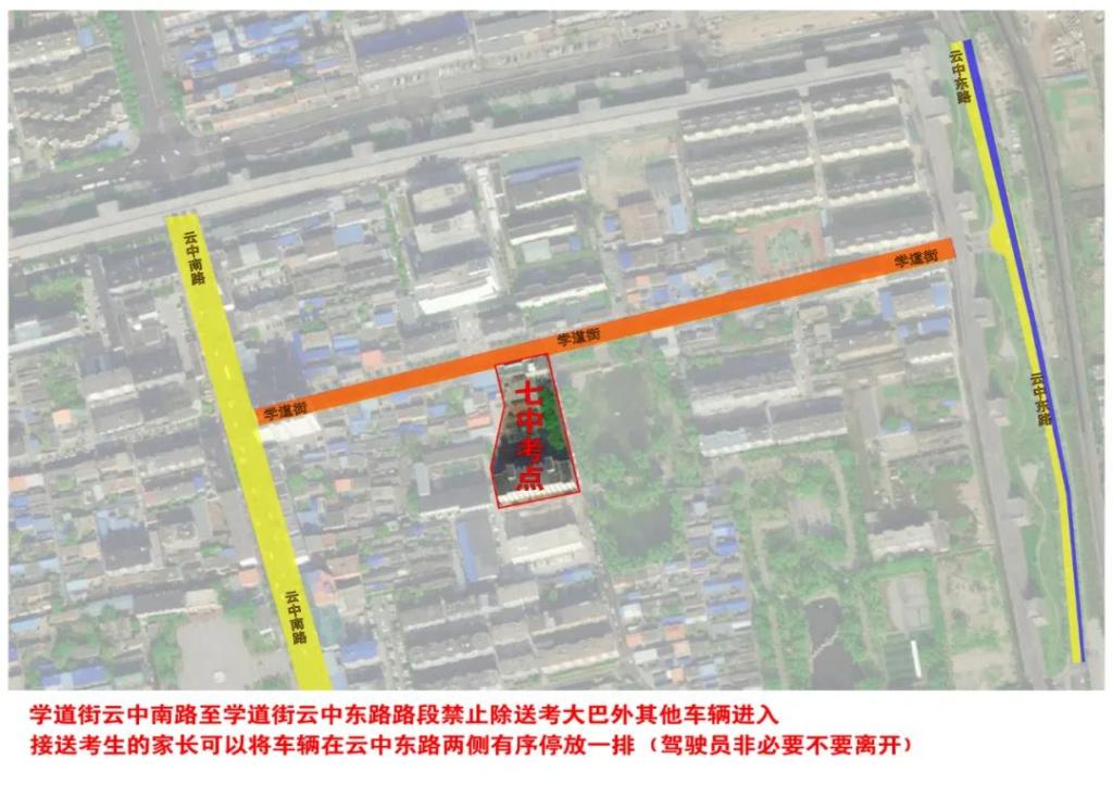 學(xué)道街(云中路至云中東路)禁止除接送考生大巴車以外的其他車輛駛?cè)?,道路南?cè)允許接送考生大巴車有序停放一排。