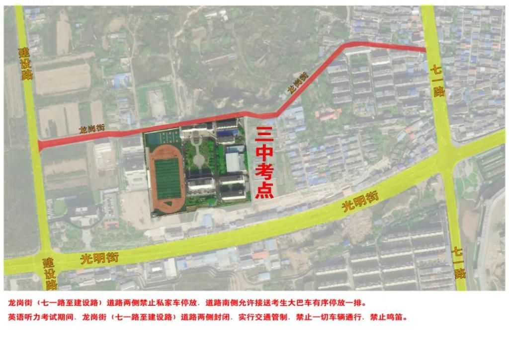 英語聽力考試期間,龍崗街(七一路至建設(shè)路)道路兩側(cè)封閉,實(shí)行交通管制,禁止一切車輛通行,禁止鳴笛。