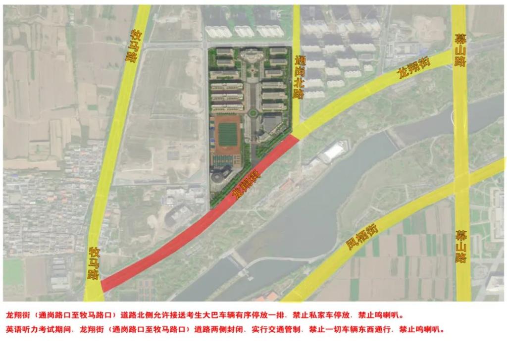 禁行路段:英語聽力考試期間,龍翔街(通崗路口至牧馬路口)道路兩側(cè)封閉,實(shí)行交通管制,禁止一切車輛東西通行,禁止鳴喇叭。