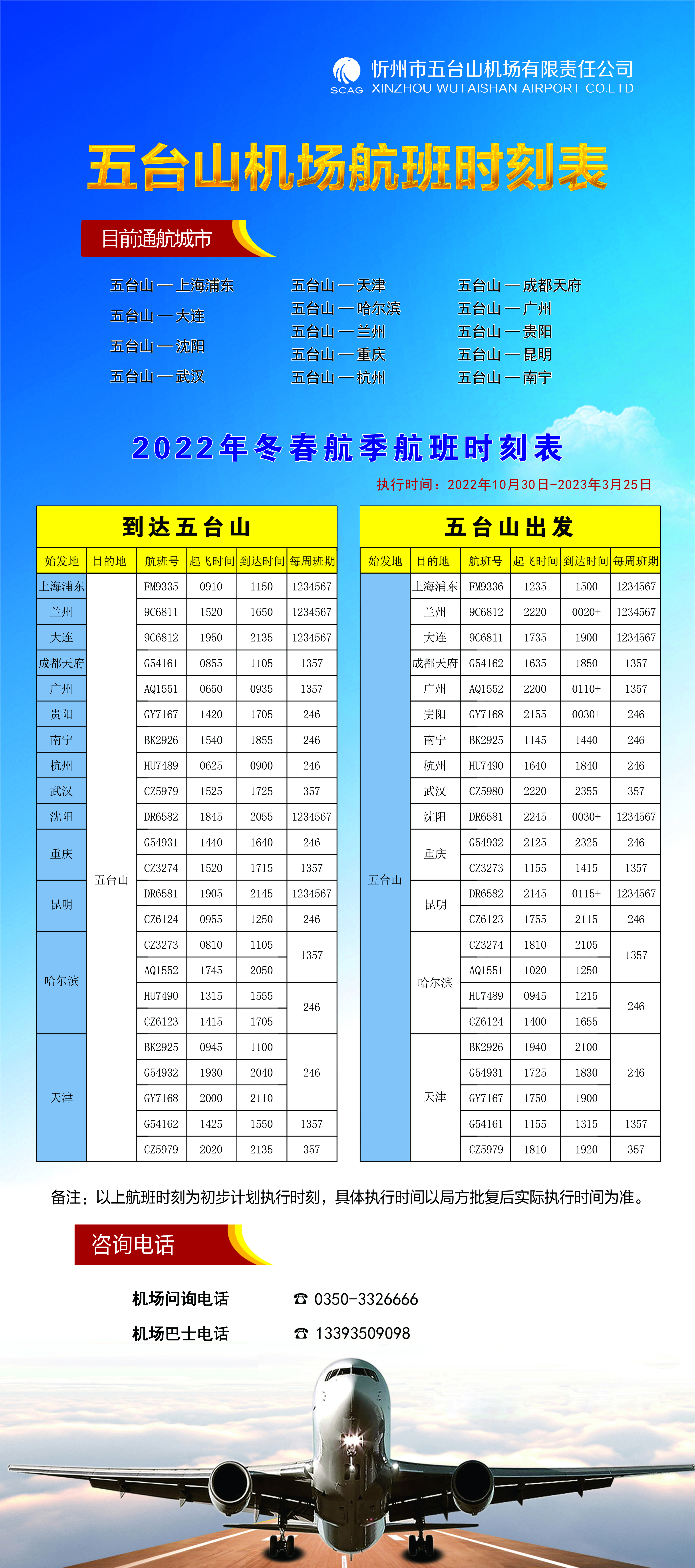 據(jù)了解,隨著國內(nèi)疫情防控措施的調(diào)整,五臺山飛機場積極協(xié)調(diào)各航空公司加快恢復(fù)航線航班速度,積極應(yīng)對航空客流快速回升的迫切需要,同時抓住即將到來的春運市場機遇,再開通昆明、沈陽、杭州、哈爾濱四個新航點。至此,五臺山機場共開通航線25條,通航城市達到22個。