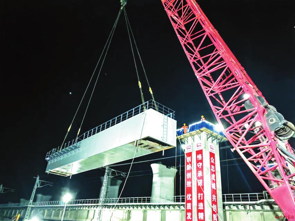 施工現(xiàn)場,項目部三工區(qū)副經(jīng)理兼吊裝施工副指揮長高攀科介紹說,“此次吊裝的575#鋼橫梁長20米,箱內(nèi)寬3.2米,高2.5米,重達136.78噸。針對夜間吊裝安全風(fēng)險高、施工難度大、配合人員復(fù)雜等困難,項目部多次召開鋼橫梁吊裝專題布置會和安全評審會,提前3個月超前規(guī)劃鋼橫梁進場路線、履帶吊拼裝、鋼橫梁吊裝驗收等工序,嚴(yán)格按照施工方案執(zhí)行,并要求現(xiàn)場所有施工人員做好安全交底,確保人人胸有成竹。吊裝過程中,為確保鋼橫梁落梁后的精準(zhǔn)定位,由技術(shù)人員對門式墩采取輪換測量和輪換復(fù)刻,并在墩身上安裝限位板,以確保鋼橫梁落梁后精準(zhǔn)可控和位置滿足圖紙要求。”