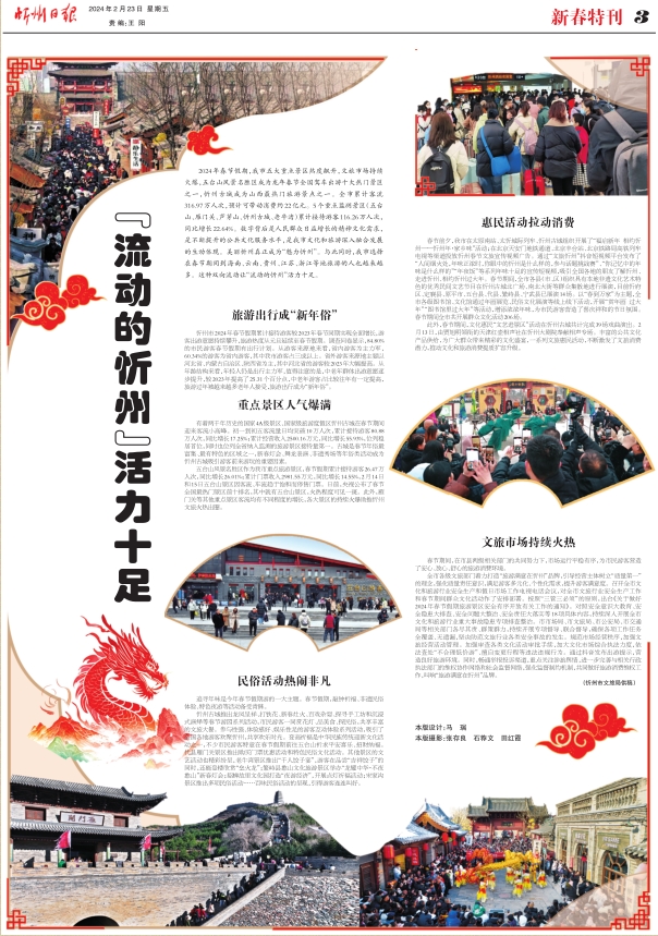 2024年春節(jié)假期,我市五大重點景區(qū)熱度飆升,文旅市場持續(xù)火爆,五臺山風(fēng)景名勝區(qū)成為龍年春節(jié)全國駕車出游十大熱門景區(qū)之一,忻州古城成為山西最熱門旅游景點之一。全市累計客流316.97萬人次,預(yù)計可帶動消費約22億元。5個重點監(jiān)測景區(qū)(五臺山、雁門關(guān)、蘆芽山、忻州古城、老牛灣)累計接待游客116.26萬人次,同比增長22.64%。數(shù)字背后是人民群眾日益增長的精神文化需求,是不斷提升的公共文化服務(wù)水平,是我市文化和旅游深入融合發(fā)展的生動體現(xiàn)。美麗忻州真正成為“魅力忻州”。與此同時,我市選擇在春節(jié)期間到海南、云南、貴州、江蘇、浙江等地旅游的人也越來越多。這種雙向流動讓“流動的忻州”活力十足。