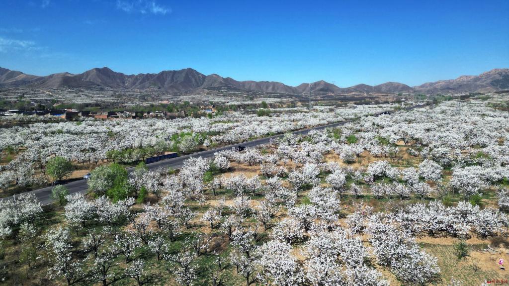 芳菲四月,在原平同川地區(qū)的黃色梯田上,晴雪綻放,香風不斷,整個原野一片香雪海。清代詩人王佩鈺曾留下“十里香風吹不斷,萬株晴雪綻梨花”的佳句,詩和遠方在梨花中完美交融。