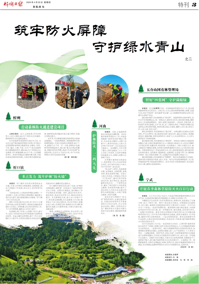 本報訊 (記者白雪萍)為進一步加強森林草原防滅火工作,堅決遏制森林草原火災的發(fā)生,入春以來,五臺山國有林管理局精心部署、迅速行動,織好“四張網(wǎng)”,筑牢森林“防火墻”,全力保障林草資源安全和人民群眾生命財產(chǎn)安全。