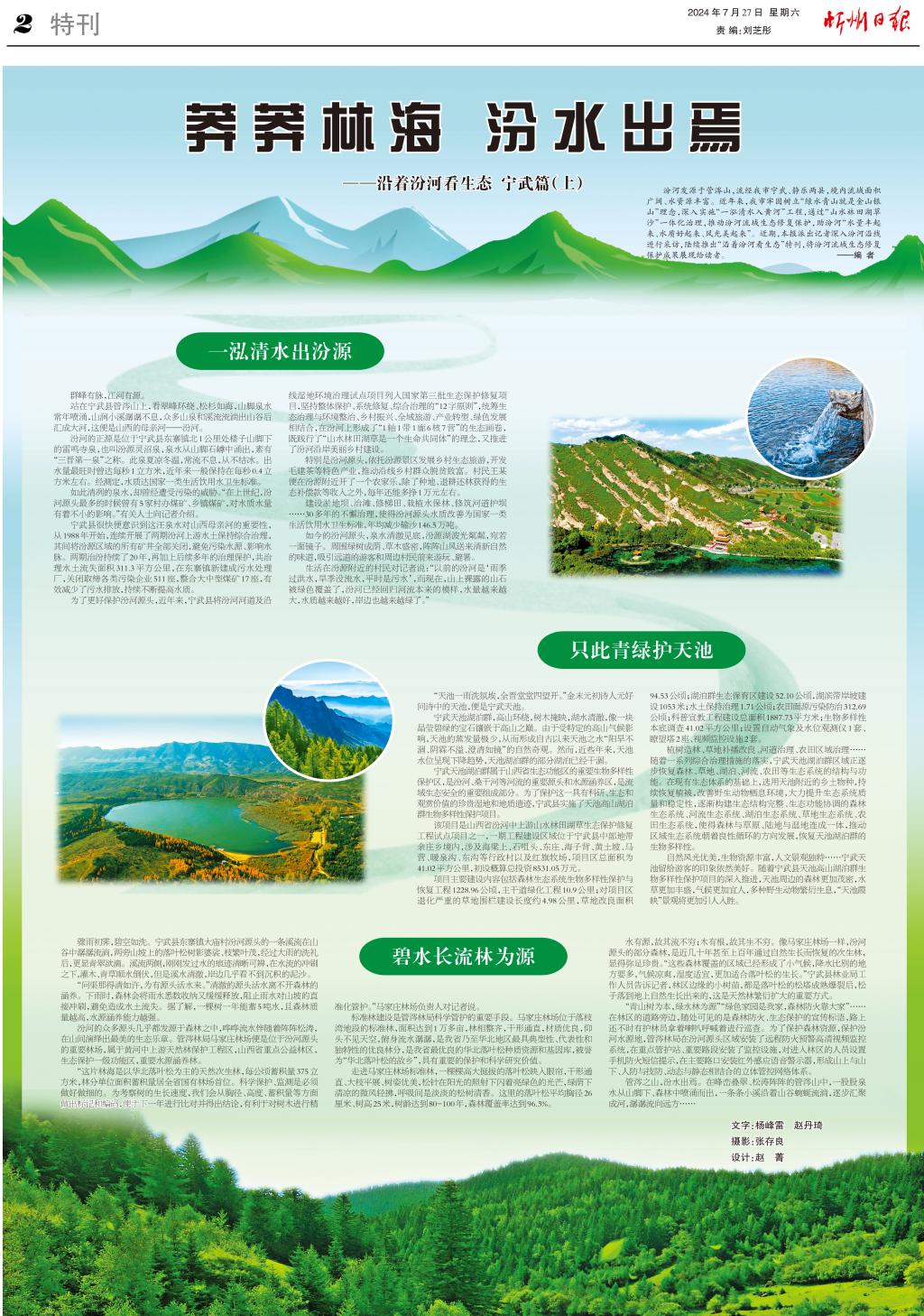 汾河發(fā)源于管涔山,流經(jīng)我市寧武、靜樂兩縣,境內(nèi)流域面積廣闊、水資源豐富。近年來,我市牢固樹立“綠水青山就是金山銀山”理念,深入實(shí)施“一泓清水入黃河”工程,通過“山水林田湖草沙”一體化治理,推動汾河流域生態(tài)修復(fù)保護(hù),助汾河“水量豐起來、水質(zhì)好起來、風(fēng)光美起來”。近期,本報(bào)派出記者深入汾河沿線進(jìn)行采訪,陸續(xù)推出“沿著汾河看生態(tài)”特刊,將汾河流域生態(tài)修復(fù)保護(hù)成果展現(xiàn)給讀者。——編 者