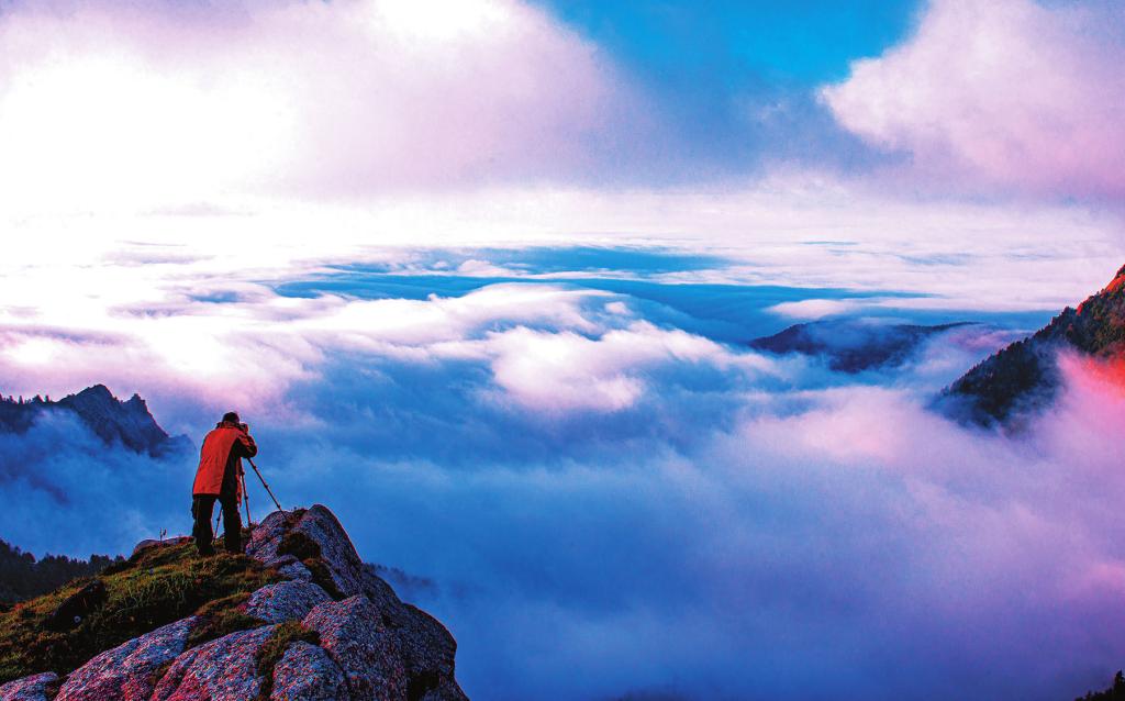 轉(zhuǎn)眼之間,已至蘆芽山腳。一路雨聲淅瀝,及至山腳已雨霽日出,一道七彩之虹凌空飛架。悟空定睛一看,雨后彩虹映射下,蘆芽山頂現(xiàn)金光萬道。那云天光閃處,偶爾有宮闕、仙人、山水、市井等圖景變幻,忽隱忽現(xiàn),忽明忽暗。這即是難得一見的蘆芽佛光,也是一處奇妙景觀。悟空亦心中暗道,這即是毗盧佛道場佛法的精義所在。許是心領(lǐng)神會,甚或心神契合,剎那,又聞劈空傳音,應(yīng)是毗盧遮那佛臨別留偈,說的是:人生一場如游戲,緊箍須解悟空心;跟著悟空游蘆芽,靈駐雷鳴聽雷音。(付彥云)