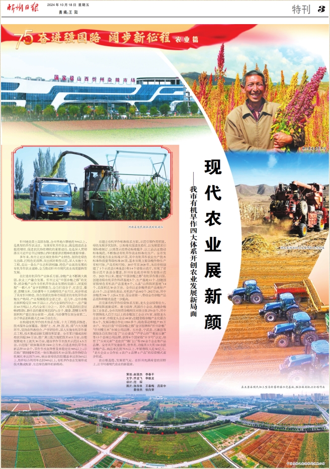 忻州地處黃土高原東緣,全市旱地占耕地的70%以上,是典型的旱作農(nóng)業(yè)區(qū)。發(fā)展有機(jī)旱作農(nóng)業(yè),既是推進(jìn)農(nóng)業(yè)提質(zhì)增效、促進(jìn)農(nóng)民持續(xù)增收的重要途徑,也是深入貫徹落實(shí)習(xí)近平總書記視察山西時(shí)重要講話精神的重要舉措。 多年來,我市立足區(qū)域優(yōu)勢和產(chǎn)業(yè)特色,堅(jiān)持走綠色生態(tài)路、打特色優(yōu)質(zhì)牌,突出抓好典型示范,深入實(shí)施十大工程,走出一條生產(chǎn)生態(tài)和諧相融、特色產(chǎn)業(yè)高效發(fā)展的有機(jī)旱作農(nóng)業(yè)道路,全力推動(dòng)忻州市現(xiàn)代農(nóng)業(yè)高質(zhì)量轉(zhuǎn)型發(fā)展。 在打造有機(jī)旱作產(chǎn)業(yè)體系方面,雜糧產(chǎn)業(yè)不斷做大做強(qiáng),農(nóng)業(yè)三產(chǎn)融合發(fā)展。忻州立足“中國雜糧之都”的優(yōu)勢,把雜糧產(chǎn)業(yè)作為有機(jī)旱作農(nóng)業(yè)發(fā)展的突破口,深度挖掘“一都八鄉(xiāng)”金字招牌潛力,全力打造谷子、紅蕓豆、藜麥、甜糯玉米、馬鈴薯等十大雜糧特優(yōu)產(chǎn)業(yè)片區(qū),初步形成了具有忻州特色、符合資源優(yōu)勢和市場需求的有機(jī)旱作雜糧生產(chǎn)格局,產(chǎn)業(yè)規(guī)模穩(wěn)居全省之首。近幾年,全市雜糧總面積穩(wěn)定在300萬畝以上,約占全省的四分之一,總產(chǎn)量在60萬噸以上,約占全省三分之一。其中,岢嵐縣的紅蕓豆暢銷國際,靜樂縣的藜麥聞名國內(nèi);谷子、糜黍、甜糯玉米等面積和產(chǎn)量位居全省第一,莜麥、馬鈴薯等位居全省第二,谷子單品面積最大達(dá)100萬畝左右。 在構(gòu)建有機(jī)旱作技術(shù)體系方面,十大工程穩(wěn)步推進(jìn),技術(shù)服務(wù)全面覆蓋。圍繞“土、水、種、技、機(jī)、綠”六大關(guān)鍵環(huán)節(jié),堅(jiān)持農(nóng)科教結(jié)合、產(chǎn)學(xué)研協(xié)作,深入實(shí)施有機(jī)旱作重點(diǎn)工程,技術(shù)集成創(chuàng)新支撐效果顯著。全市累計(jì)建成高標(biāo)準(zhǔn)農(nóng)田超200萬畝,推廣測土配方施肥技術(shù)613萬畝,治理坡耕地水土流失30萬畝,建設(shè)旱作節(jié)水技術(shù)示范區(qū)6.5萬畝,示范推廣軟體集雨窖3500立方米;引進(jìn)選育抗旱節(jié)水新品種10余個(gè),旱作節(jié)水良種普及率穩(wěn)定在90%以上;示范推廣膜側(cè)播種藝機(jī)一體化集成技術(shù)10余項(xiàng);農(nóng)作物綜合機(jī)械化率達(dá)到71.8%,病蟲害綠色防控覆蓋率達(dá)到56%以上,秸稈綜合利用率達(dá)到90%以上,有機(jī)旱作農(nóng)業(yè)發(fā)展形成技術(shù)集成配套、生態(tài)綠色循環(huán)的新格局。 在建立有機(jī)旱作標(biāo)準(zhǔn)體系方面,示范引領(lǐng)作用明顯,綠色發(fā)展步伐加快。以標(biāo)準(zhǔn)化促進(jìn)優(yōu)質(zhì)化、以發(fā)展需求引領(lǐng)標(biāo)準(zhǔn)制訂、以典型示范帶動(dòng)標(biāo)準(zhǔn)提升、以三品認(rèn)證推動(dòng)標(biāo)準(zhǔn)規(guī)范,不斷推動(dòng)有機(jī)旱作農(nóng)業(yè)標(biāo)準(zhǔn)化生產(chǎn)。全市發(fā)布市級(jí)地方農(nóng)業(yè)標(biāo)準(zhǔn)37項(xiàng),其中有機(jī)旱作農(nóng)業(yè)生產(chǎn)技術(shù)標(biāo)準(zhǔn)和質(zhì)量等級(jí)標(biāo)準(zhǔn)20項(xiàng),基本實(shí)現(xiàn)主要雜糧作物生產(chǎn)有標(biāo)可依、產(chǎn)品有標(biāo)可檢。2017年至2020年,先后申報(bào)創(chuàng)建了1個(gè)示范縣(神池縣)和14個(gè)省級(jí)示范片,實(shí)現(xiàn)了省級(jí)示范片縣縣全覆蓋,忻州市也成功申報(bào)為省級(jí)示范市。2021年以來,建設(shè)“中國雜糧之都”有機(jī)旱作展示園,創(chuàng)建省級(jí)有機(jī)旱作科研基地5個(gè)、生產(chǎn)基地11個(gè),創(chuàng)建國家級(jí)綠色有機(jī)農(nóng)產(chǎn)品基地8個(gè),入選“山西供深基地”14個(gè),總面積達(dá)50余萬畝。全市認(rèn)證雜糧類農(nóng)產(chǎn)品地標(biāo)產(chǎn)品15個(gè),認(rèn)證綠色食品、有機(jī)農(nóng)產(chǎn)品602個(gè)、202萬畝,其中雜糧類396個(gè)、125.6萬畝,居全省第一,帶動(dòng)全市雜糧產(chǎn)品品質(zhì)和種植效益進(jìn)一步提高。 在完善有機(jī)旱作經(jīng)營體系方面,龍頭企業(yè)培育壯大,品牌矩陣逐漸成形。著力培育、鞏固百小企業(yè),構(gòu)建雜糧加工業(yè)體系,全市共培育雜糧相關(guān)市場主體270余個(gè),其中年銷售收入百萬元以上的雜糧加工企業(yè)171家、省級(jí)龍頭企業(yè)33家、市級(jí)龍頭企業(yè)48家;創(chuàng)建省級(jí)雜糧產(chǎn)業(yè)化聯(lián)合體6個(gè),發(fā)展雜糧合作社1550多個(gè),吸收帶動(dòng)種植戶55萬余戶。突出打造“中國雜糧之都”金字招牌和“忻州雜糧”“忻州糯玉米”市域公用品牌。五臺(tái)縣、寧武縣、五寨縣等圍繞各自優(yōu)勢打造了“五臺(tái)齋選”“蘆芽山珍”“糧裕五寨”等13個(gè)縣域公用品牌,獲得8個(gè)國家級(jí)“鄉(xiāng)字號(hào)”認(rèn)定,培育了“玉米兄弟”“老農(nóng)貢”“雁門山”等150余個(gè)企業(yè)和產(chǎn)品品牌。全市共開發(fā)速食類、營養(yǎng)類、功能類3大類130余款雜糧產(chǎn)品,商品率達(dá)到75%以上,年銷售收入近50億元?!褒堫^企業(yè)+合作社+農(nóng)戶+品牌+產(chǎn)品”的經(jīng)營模式逐步形成。 農(nó