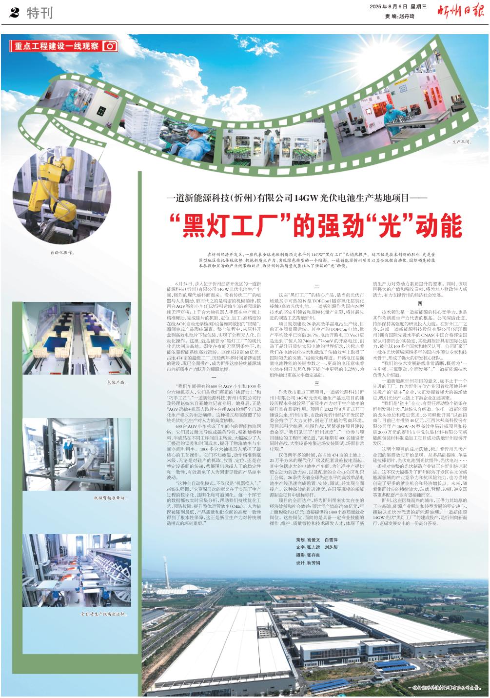 6月24日,步入位于忻州經(jīng)濟(jì)開(kāi)發(fā)區(qū)的一道新能源科技(忻州)有限公司14GW光伏電池生產(chǎn)車(chē)間,強(qiáng)烈的現(xiàn)代感撲面而來(lái)。沒(méi)有傳統(tǒng)工廠的喧囂與人頭攢動(dòng),取而代之的是精密的機(jī)械韻律:數(shù)百臺(tái)AGV智能小車(chē)(自動(dòng)導(dǎo)引運(yùn)輸車(chē))沿著預(yù)設(shè)路線無(wú)聲穿梭;上千臺(tái)六軸機(jī)器人手臂在生產(chǎn)線上精準(zhǔn)舞動(dòng),完成硅片的抓取、定位、加工;高精度的在線AOI(自動(dòng)光學(xué)檢測(cè))設(shè)備如同敏銳的“眼睛”,瞬間完成產(chǎn)品瑕疵篩查。整個(gè)流程中,從原料開(kāi)盒到高效電池片下線包裝,實(shí)現(xiàn)了全程無(wú)人化、自動(dòng)化操作。這里,就是被譽(yù)為“黑燈工廠”的現(xiàn)代化光伏制造基地。即使在夜間無(wú)照明條件下,也能依靠智能系統(tǒng)高效運(yùn)轉(zhuǎn)。這座總投資60億元、占地474畝的超級(jí)工廠,歷經(jīng)兩年多時(shí)間緊鑼密鼓的建設(shè),現(xiàn)已全面投產(chǎn),成為忻州這座傳統(tǒng)能源城市向新質(zhì)生產(chǎn)力躍升的耀眼地標(biāo)。