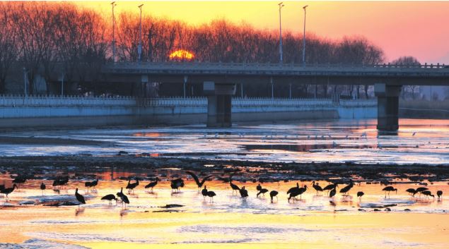 作為國家4A級旅游景區(qū),滹源景區(qū)依托滹沱河生態(tài)資源而建,220萬平方米的區(qū)域內(nèi),“一帶二廊三區(qū)串珠狀”的分布格局,將濕地、河島、蘆葦蕩等多樣生態(tài)景觀有機串聯(lián)。全長80公里的滹沱河穿境而過,橡膠壩蓄水形成的連片淺灘水質(zhì)澄澈,魚蝦、水生昆蟲等生物資源豐沛,完美契合了黑鸛淺水區(qū)覓食、喜靜避擾的生活習性,為它們提供了理想的棲息環(huán)境。